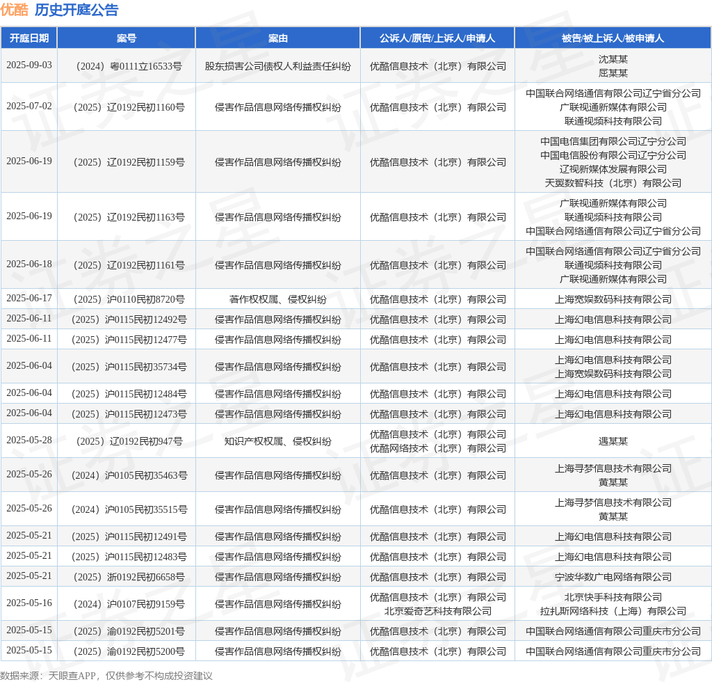 案号:(2025)鄂0192民诉前调545号审理法院:武汉东湖新技术开发区人民法院案由:侵害作品信息网络传播权纠纷当事人信息: 原告/上诉人:优酷信息技术(北京)有限公司 被告/被上诉人:湖北豪鲁胜网络科技有限公司开庭日期:2025年4月27日根据统计,近一年内以优酷信息技术(北京)有限公司为当事人的历史开庭公告有467则,其中案由为“侵害作品信息网络传播权纠纷”的公告以336则居首,其次为“侵害其他著作财产权纠纷”有31则,“侵害作品信息网络传播权”有21则。历史开庭公告(前20条)如下: