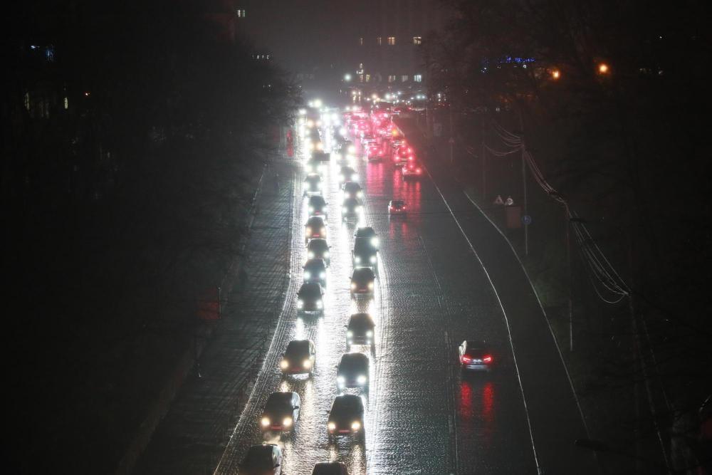 2025年11月20日,乌克兰首都基辅主要街道的照明设施出现大面积停电,车辆在夜色中行驶。